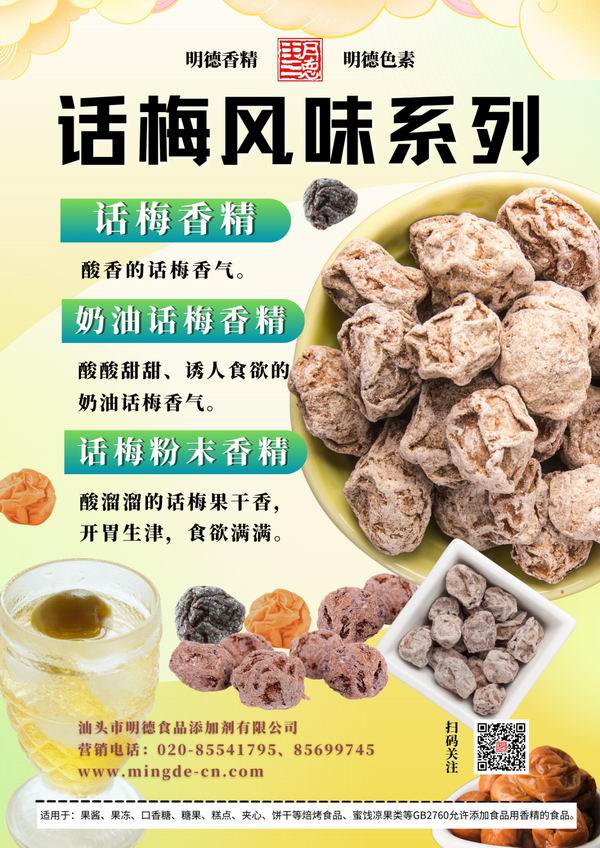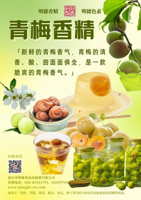 在梅子風味香精領(lǐng)域我們數(shù)十年潛心專研,迎合市場需求,滿足消費者喜好,汕頭市明德食品添加劑有限公司,推出了多種款梅子風味香精,如:青梅風味、酸梅風味、話梅風味、酸梅湯風味等。