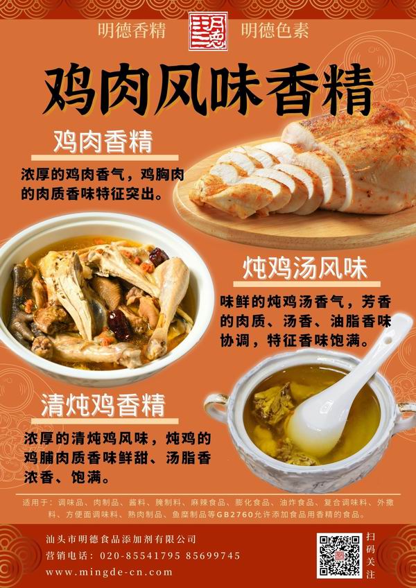 在雞肉香精領(lǐng)域我們潛心專研,結(jié)合市場潮流,消費(fèi)者喜好,汕頭市明德食品添加劑有限公司現(xiàn)有以下16種雞肉相關(guān)風(fēng)味的香精,供您選擇。并持續(xù)努力研發(fā)更多符合市場需求的風(fēng)味。