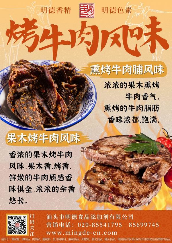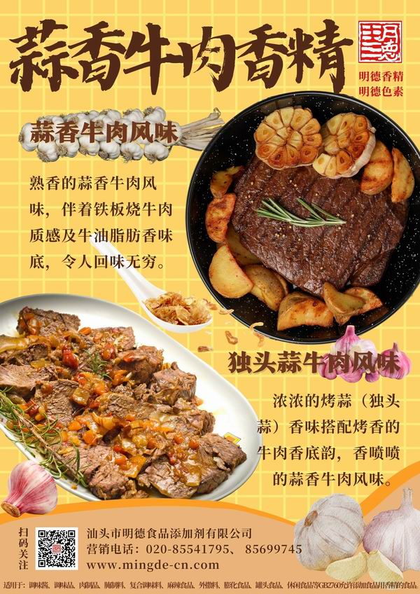 醬香、紅燒牛肉香精 肉香濃郁厚實;烤牛肉風味 烤香濃郁、脂肪香特征明顯;蒜香牛肉香精,蒜香十足,牛肉底韻濃厚;黑椒牛肉香精,椒香四溢,辛香肉香融合;鹵水牛肉香精 香味醇厚,讓人垂涎欲滴。明德 牛肉香精 香味濃郁悠長、耐溫性好(耐高溫)、適用性廣、風味醇厚。產品參數